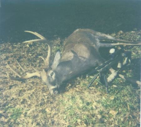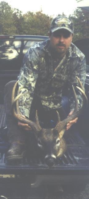 This buck killed by Bruce Jennings in Madison parish bordering the Tensas wildlife refuge November 2002. he scored in at 139 3/8 weighing in at 220 lbs at check station. 6" bases 18 1/2 wide. Tensas had its lottery hunt going on and some hunters spooked him over me out of a swamp. He had 2 does with him but he was way ahead of these does looking for cover!